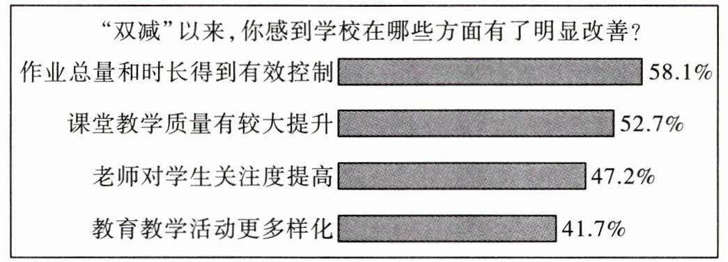 )(3分)A.问卷调查显示:一半以上的中小学学生家长认为学生作业总量和时长得到有效控制、课堂教学质量有了较大提升、教育教学活动更加多样化。