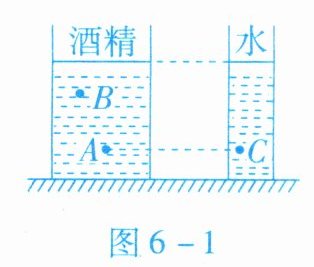 4. 如图6-1所示,A、B、C三点所受液体的压强$p_{A}$、$p_{B}$、$p_{C}$由大到小的顺序是