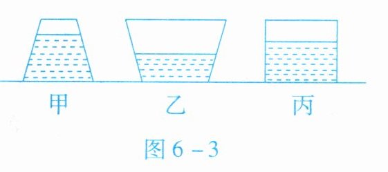 7. 如图6-3所示,在水平桌面上,质量相同、底面积相同、形状不同的三个容器甲、乙、丙内装有质量相同的水。甲、乙、丙三个容器中,水对容器底部的压力$F_{甲}$、$F_{乙}$、$F_{丙}$的大小关系是