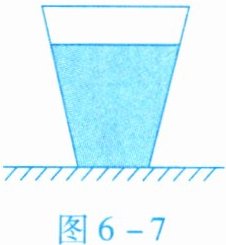15. 如图6-7所示,一个盛有水的杯子静止在水平桌面上。杯子的重力为1N,高为9cm,底面积为30cm^2;杯内水的重力为2N,水深为6cm,水的密度为$1.0×10^{3}kg/m^{3}$,g取10N/kg。求: