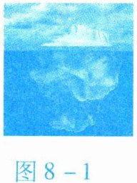 6. 如图8-1所示,漂浮在海面上的冰山露出水面的部分仅为其体积的$\frac{1}{10}$,则冰山的密度与海水的密度之比$\rho_{冰}:\rho_{海}=$