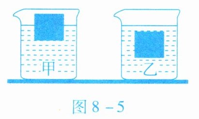 10. 如图8-5所示,水平桌面上两只相同的烧杯中分别盛有甲、乙两种不同的液体,两个相同的物块在液体中静止时,两烧杯内的液面相平,则(