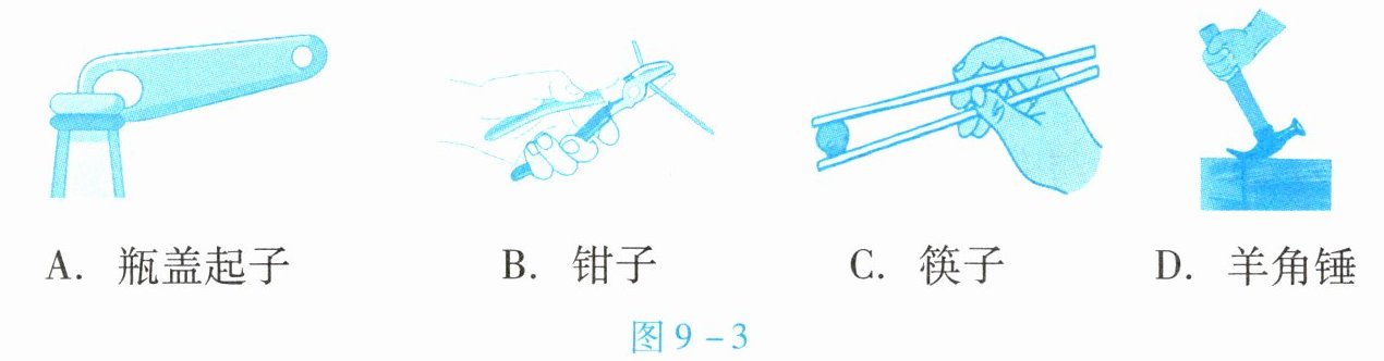 6. 图 9 - 3 所示的四种情景中,所用的工具属于费力杠杆的是(
