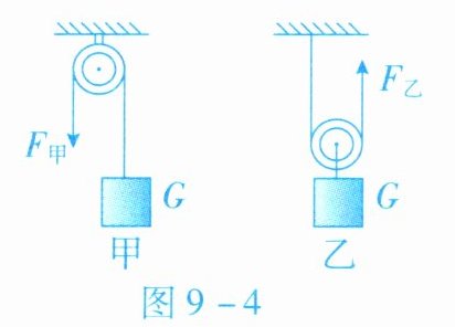 11. 用图 9 - 4 所示的两个滑轮分别将重力相同的甲、乙两物体匀速提升相同的高度,所用的拉力分别为$F_{甲}$、$F_{乙}$,它们的机械效率分别为$\eta_{甲}$、$\eta_{乙}$。则下列关系正确的是(不计绳重与摩擦,且$G_{动} < G$)(