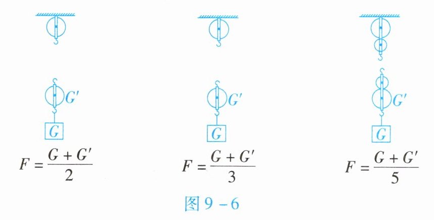 13. 按图 9 - 6 中所给的省力条件,画出各滑轮组绳子的绕法。图中 G 表示物重,$G'$表示动滑轮重,F 表示人对绳子的拉力。(不计绳重及摩擦)