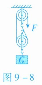 15. 一名工人用图 9 - 8 所示的滑轮组匀速提升质量为 80 kg 的货物,所用的拉力 F 为 500 N,货物在 50 s 内被提升了 2 m。求:(g 取 10 N/kg)