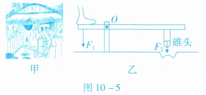 7. 图 10 - 5 甲是我国古代的科技著作《天工开物》里记载的一种捣谷用的春,“横木穿插碓头……足踏其末而春之。”图 10 - 5 乙为脚用力向下踩时在某一位置的示意图,O 点为支点,$F_{2}$为阻力(即碓头的重力大小),不计横木的重力和摩擦,此时春属于