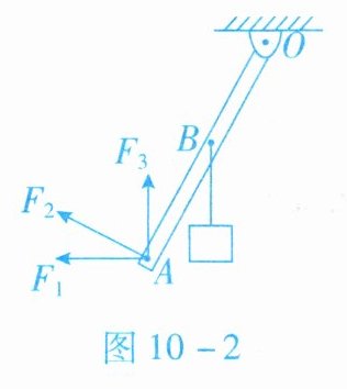 4. 如图 10 - 2 所示,O 点为杠杆的支点,B 点挂一重物,在 A 点分别作用三个不同方向的力$F_{1}$、$F_{2}和F_{3}$,均能使杠杆在图示位置平衡,则这三个力中,力最小的是