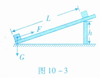 5. 如图 10 - 3 所示,将重力为 10 N 的物体从底端沿斜面向上匀速拉到顶端。若斜面长 L 为 1 m,高 h 为 0.3 m,拉力 F 为 4 N,拉力做功的功率为 2 W,则此过程中,斜面的机械效率是