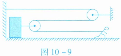 13. 图 10 - 9 是一名工人用滑轮组将仓库中的货物沿水平轨道拉出的示意图。已知货物的质量为 600 kg,所受轨道的摩擦力为其重力的 0.1 倍,滑轮组的机械效率为 75%。若工人以 0.5 m/s 的速度匀速前行,经 100 s 将货物拉出仓库,g 取 10 N/kg。求: