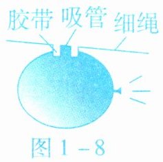 如图1-8所示,将一小段吸管用胶带固定在充满气的气球上,将一根细绳穿过吸管并水平拉直,松开气球的吹气口,气球会沿着细绳快速向前运动。请你思考气球为什么会向前运动?