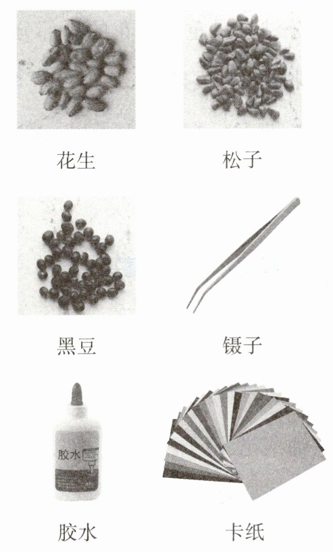花生、松子、黑豆、镊子、胶水、卡纸等。