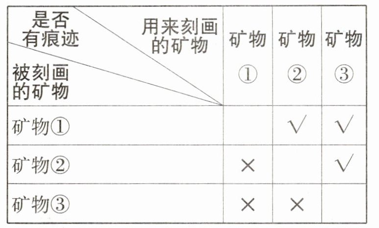 (2)胜胜的这块岩石是由石英、长石、云母这三种矿物组成的,同学们凑齐这三种矿物,用相互刻画的方法来比较它们的硬度,下表是实验记录。“√”表示有痕迹,“×”表示无痕迹。