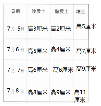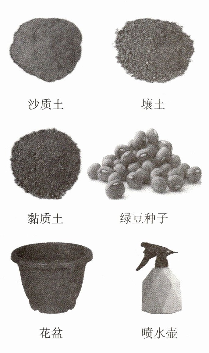 将绿豆种子分别种在沙质土、黏质土和壤土中,定期浇同样多的水,观察并记录绿豆的长势。