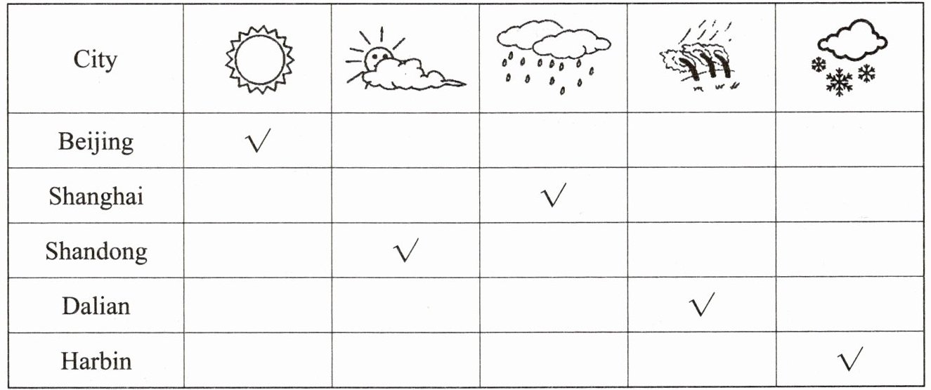 Hello! Here's the weather report. It's sunny in Beijing. It's cloudy in Shandong. It's rainy in Shanghai. It's windy in Dalian. It's snowy in Harbin.