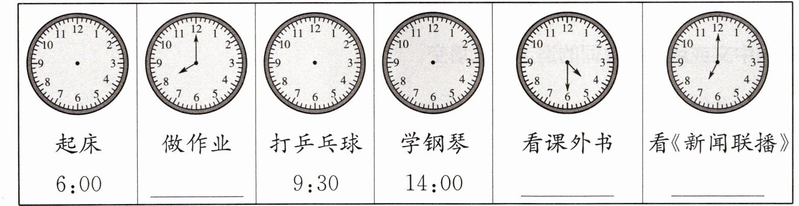 一 小明周末的一天。(用24时记时法填写时间或补画时针和分针)