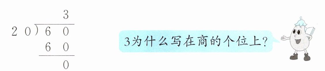 【解析】:在进行除法运算时,商的位置要根据被除数和除数的关系来确定。对于$60\div20$,是用$60$这个两位数除以$20$,$60$里面最多有$3$个$20$,这里的$3$表示$3$个一,所以$3$要写在商的个位上。
