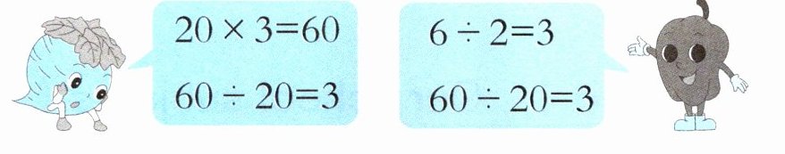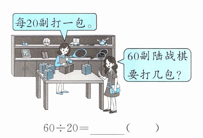 包。过程探索(1)计算 $ 60 ÷ 20 $ 的方法有很多:① $ 60 - 20 - 20 - 20 = 0 $,根据除法是减法的简便算法,从减法想起;② $ 20 × 3 = 60 $,根据乘法是除法的逆运算,从乘法想起;③根据 $ 6 ÷ 2 = 3 $,从“二三得六”这句乘法口诀想起。这些算法都正确、合理,但最后一种算法的思路更简捷、明了。