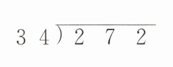 【解析】:在计算$272\div34$时,采用试商的方法,先把$34$看作$30$试商,通过计算$9\times34 = 306$,发现$306\gt272$,说明初商$9$偏大,调小后得到商$8$,最后通过竖式计算验证$272\div34 = 8$。
