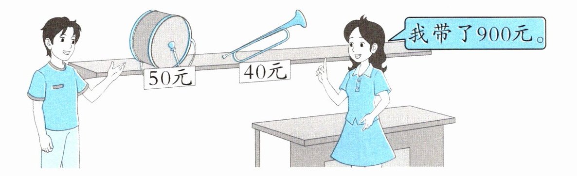 (2)根据题意,列出除法算式:$900÷40$,用竖式计算时,同时去掉被除数和除数末尾的一个0。此时商是22,表示900元里有22个40元,即可以买22把队号。900元里减去22个40元,剩余20元,所以竖式中余下的2应该表示20。