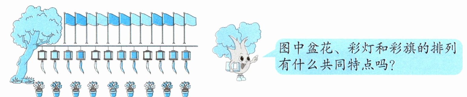 【答案】:图中盆花、彩灯和彩旗的排列都是有规律的,每种物体都是几个一组地排列的。一种物体中,每组的排列顺序都相同。