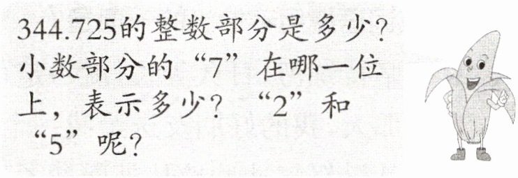 你能读出上面横线上的数吗? 344.725的整数部分是多少?小数部分的“7”在哪一位上,表示多少?“2”和