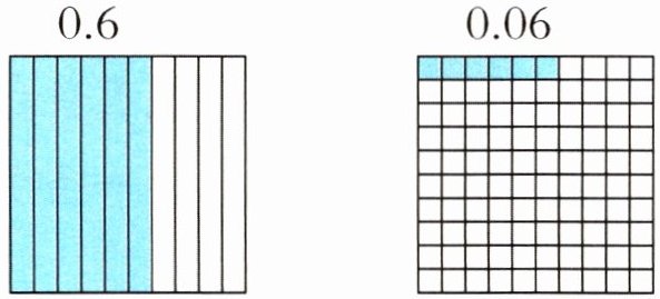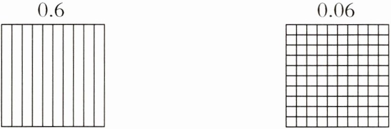 过程探索 6个$\frac {1}{10}是\frac {6}{10}$→6个0.1是0.6→0.6里面6个有0.1;6个$\frac {1}{100}是\frac {6}{100}$→6个0.01是0.06→0.06里有6个0.01。小数点右边第一位是十分位,计数单位是十分之一(0.1);小数点右边第二位是百分位,计数单位是百分之一(0.01);小数点右边第三位是千分位,计数单位是千分之一(0.001)……每相邻两个计数单位间的进率都是10。