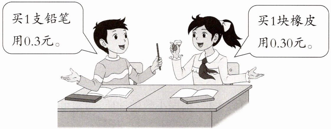 过程探索 1. 判断橡皮和铅笔的单价是否相等。方法一:根据元、角、分之间的进率判断:0.3元= 3角,0.30元= 30分= 3角,所以0.3元= 0.30元。方法二:根据小数的意义判断:0.3是3个0.1,0.30是30个0.01,也可以看作3个0.1,所以0.3= 0.30。