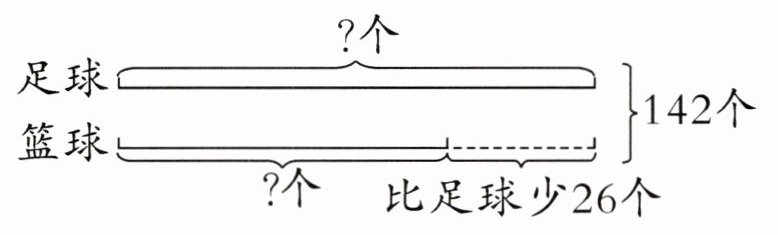1. 已知条件:足球和篮球共有 142 个,篮球比足球少 26 个。
