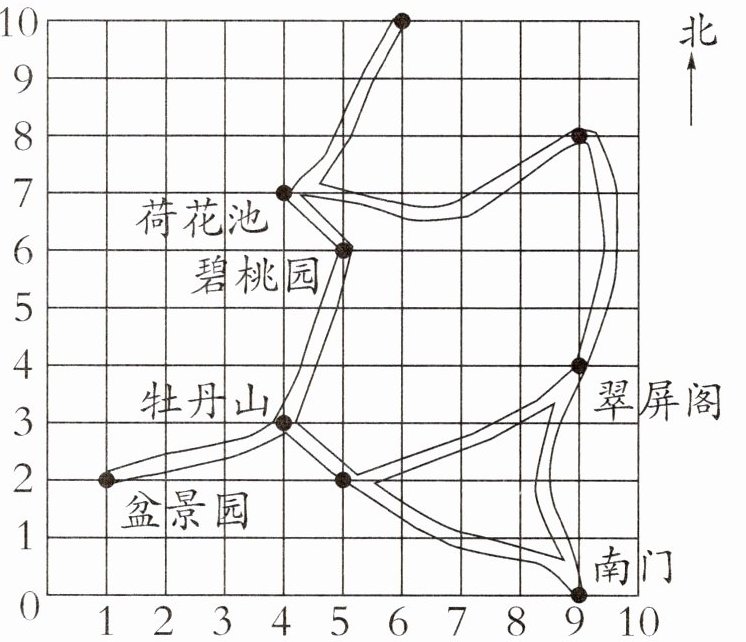 (2)周日,王彤游览了植物园,她的活动路线是:$(6,10)→(4,7)→(5,6)→(4,3)→(5,2)→(9,4)→(9,0)$,王彤这一天先后去过哪些地方?