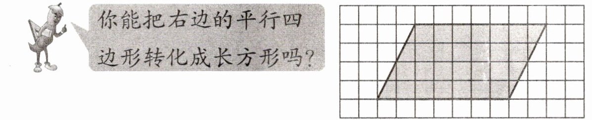 过程探索 把一个平行四边形转化成长方形,要使所拼图形出现直角,才符合长方形的特征。沿平行四边形的任意边上的一条高剪成两个图形后,通过平移能拼成长方形。