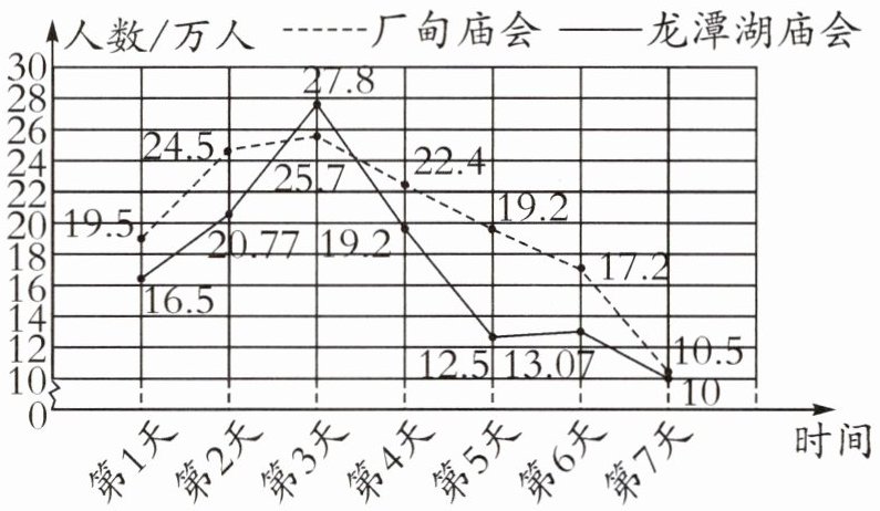 (3)从统计图看出,第 5 天两个庙会的游客人数差距最大。(合理即可)