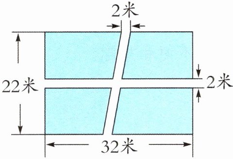 下图是一块长方形草地,长是32米,宽是22米。现在中间修了两条小路,一条是平行四边形小路,一条是长方形小路。草地部分(涂色部分)的面积有多大?