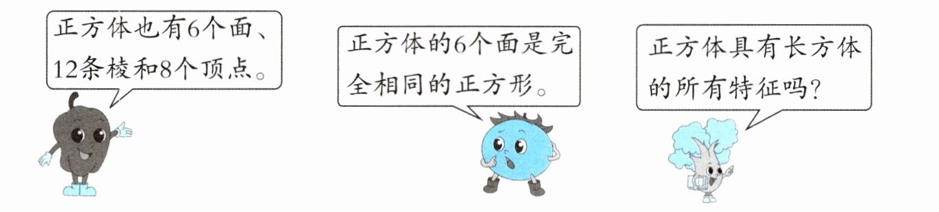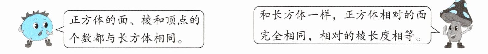 例2 正方体有几个面、几条棱和几个顶点?它的面和棱各有什么特点?与同学交流。