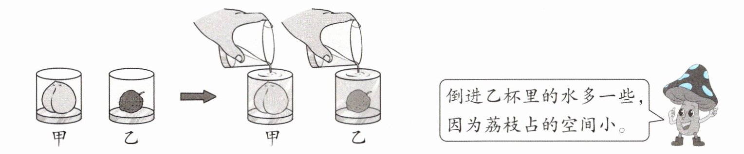 在甲、乙两个同样大的玻璃杯里分别放一个桃和一个荔枝,再往这两个杯里倒满水。倒进哪个杯里的水多一些?为什么?