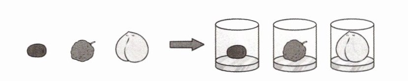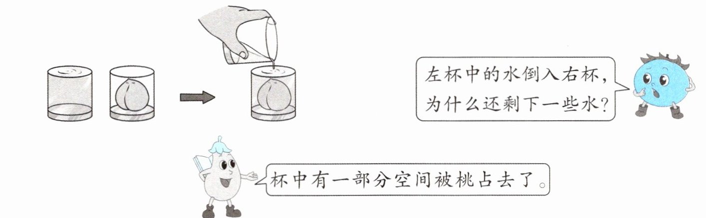 下面三个水果,哪一个占的空间大?想一想,如果把它们放在同样大的杯中,再倒满水,哪个杯里水占的空间大?