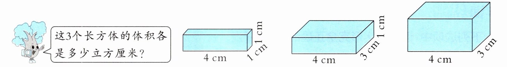例2 用体积为1立方厘米的小正方体摆出下面的长方体,各需要多少个?先想一想,再摆一摆。