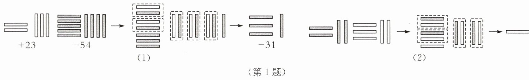 1. 魏晋时期数学家刘徽在《九章算术注》中用不同颜色的算筹(小棍形状的记数工具)分别表示正数和负数(白色为正,黑色为负),图(1)表示的是$(+23)+(-54)= -31$的计算过程,则图(2)表示的计算过程是(