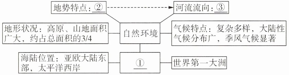 1. B 2. D 3. D [解析]第 1 题,世界第一大洲是亚洲。世界上跨经度最广的大洲是南极洲;世界上跨纬度最广的大洲、东西距离最长的大洲、面积最大的大洲都是亚洲。第 2 题,读材料可知,①大洲是亚洲,亚洲的地势特点是中部高、四周低。第 3 题,河流的流向主要取决于地势的高低。由于亚洲地势中部高、四周低,亚洲河流一般发源于中部高原、山地,由中部流向四周。