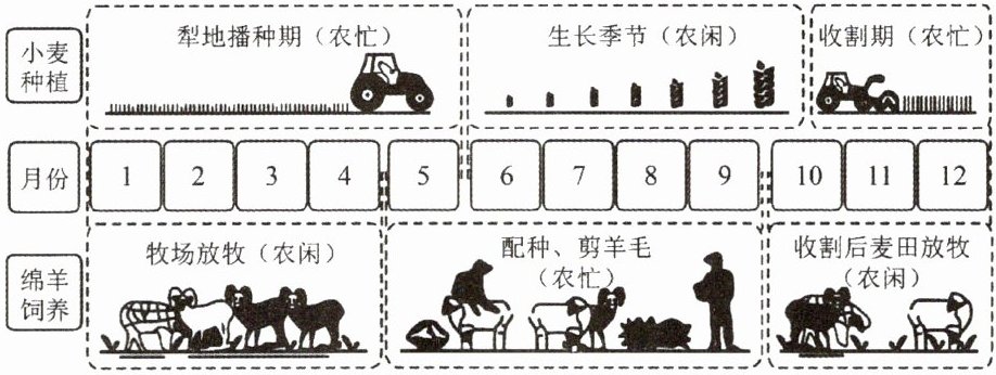 澳大利亚被称为“骑在羊背上”的国家。每年8~9月,很多牧场会举办剪羊毛比赛。下图示意澳大利亚某地的绵羊-小麦混合经营农事安排。据此回答5~6题。