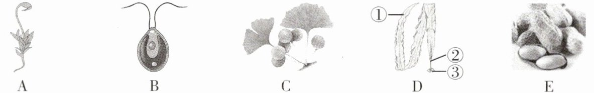(填字母)。(4)图 C 和图 E 都属于种子植物,它们的区别是