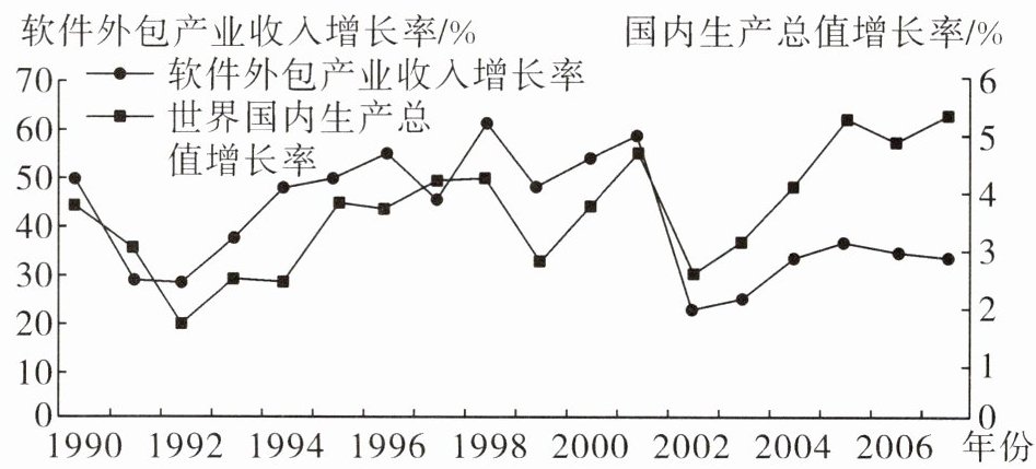 7. 读印度软件外包产业收入增速与世界国内生产总值增速的比较图,分析下列关于印度软件外包产业的叙述正确的是(