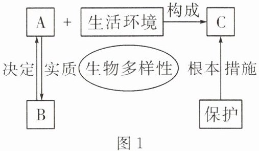 7. 下图 1 是“生物多样性之间关系”的概念图,A、B、C 三项共同组成了生物多样性。请分析并回答下列相关问题。