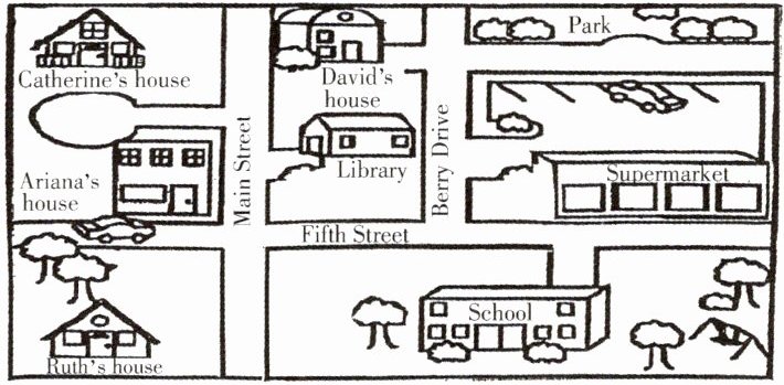 Ruth is a student of Grade 7. This is the map of her neighbourhood. It is a quiet neighbourhood. Ruth loves it. Her friends Ariana, David and Catherine live here too. They go to the same school, but they are not in the same class.