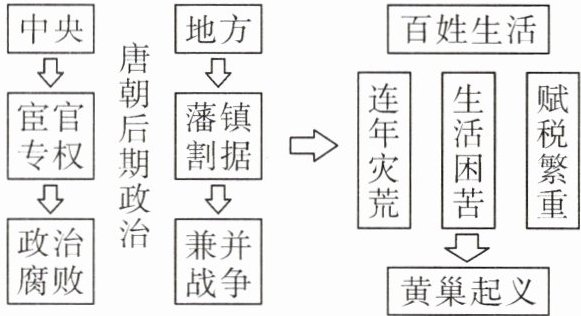 C [解析]根据结构图并结合所学知识可知,唐朝后期,政治腐败,宦官专权,藩镇割据的态势越来越严重,而且相互之间发生兼并战争,民众赋役繁重,生活困苦,又遇到连年的灾荒,无以为生,最终导致黄巢起义的爆发,故C项正确;安史之乱使唐朝的国势由盛转衰,排除A项;材料没有体现唐朝灭亡,排除B项;黄巢起义使唐朝受到致命打击,这是黄巢起义的影响,排除D项。