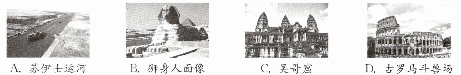 4. A 5. B [解析]第 4 题,依据材料信息和所学知识分析可知,位于埃及境内的“大江”是尼罗河,是世界第一长河。第 5 题,苏伊士运河是近代开掘出来的,不属于古埃及文明;狮身人面像是古埃及文明著名的代表性产物;吴哥窟属于东南亚的建筑;古罗马斗兽场位于意大利。
