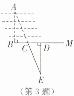 3. 如图,要测量河两岸相对的两点 $ A $、$ B $ 的距离,可在河的一侧取 $ AB $ 的垂线 $ BM $ 上两点 $ C $、$ D $,使 $ BC = CD $,再画出 $ BM $ 的垂线 $ DE $,使 $ E $ 在 $ AC $ 的延长线上,若 $ BD = 10 \text{ m} $,$ DE = 12 \text{ m} $,$ CE = 13 \text{ m} $,则 $ A $、$ B $ 两点的距离是(