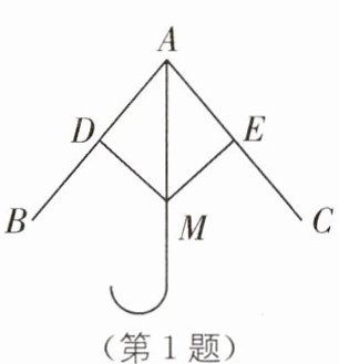 1. 雨伞在开合过程中某一时刻截面图如图所示,伞骨 $ AB = AC $,点 $ D $、$ E $ 分别是 $ AB $、$ AC $ 的中点,$ DM $、$ EM $ 是支架,且 $ DM = EM $,在将伞打开的过程中,总有 $ \triangle ADM \cong \triangle AEM $,这里得到两个三角形全等的依据是(