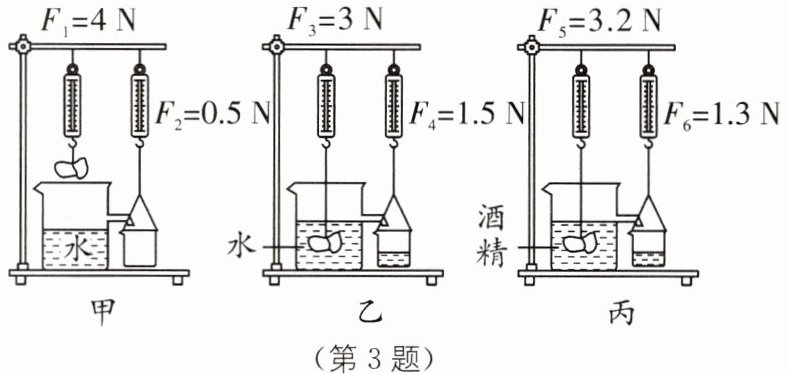 (5)继续实验,将物块浸没在装满酒精的溢水杯中,如图丙所示,发现$F_{5}>F_{3}$,说明物块受到的浮力大小与