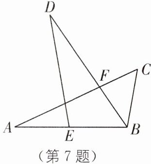 7. 如图,已知 $ △ABC\cong △DEB $,点 E 在 AB 上,AC 与 BD 交于点 F, $ AB = 6 $, $ BC = 3 $, $ ∠C = 55^{\circ} $, $ ∠D = 25^{\circ} $.
